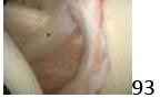 DISCUSSION: The arthroscopic image shows the anterior structures of the glenohumeral joint from a posterior portal. The asterisk indicates the middle glenohumeral ligament. Whereas there is significant variability in its appearance, the classic arrangement appears as a folded thickening in the anterior capsule that crosses the subscapularis tendon at a 45-degree angle to insert on the anterior superior neck of the glenoid, on the labrum, or just medial to it. The subscapularis is seen anterior to the middle glenohumeral ligament. The superior glenohumeral ligament and biceps tendon are not visible in this image. The Preferred Response to Question # 93 is 3.