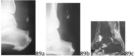 10. # 89a 89b 89c A 47-year-old man reports a 12-week history of pain and swelling of his right hindfoot and ankle. Examination reveals a significant limp with swelling and tenderness over the distal Achilles tendon. He also has weak plantar flexion strength and squeezing of his calf produces only a small amount of ankle plantar flexion that is much less than his asymptomatic contralateral ankle. He reports suffering an Achilles tendon rupture some years ago that was treated in a cast. A radiograph obtained at that time is shown in Figure 89a. He was sent for physical therapy and did well except for a mild persistent limp. He then returned 1 year later