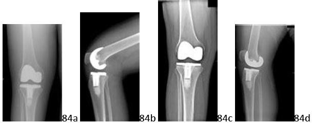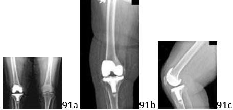 DISCUSSION: The radiographs show a change in femoral component position with proximal migration and a change in alignment from the initial near anatomic to a more varus position. Polyethylene wear is the most common contributor to both focal osteolysis and component loosening at long-term follow-up. The knee performed well for 12 years with good initial alignment, so a technical factor at the index surgery would not explain the development of loosening. Laboratory findings are not consistent with infection. There is no clinical information in the history that would suggest that the patient has either instability or poor function in the extensor mechanism. The Preferred Response to Question # 91 is 3.