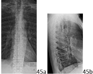 DISCUSSION: The L3 vertebral body shows the classic vertical striations of a vertebral hemangioma. On axial images, these would appear as a collection of bony spots as they are seen endon. Paget's disease may have areas of sclerotic trabeculae but the vertebrae appear square and enlarged with thickened cortex and demonstrate no organization in the mineral density. Giant cell
