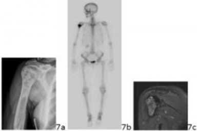 5. # .7a 7b 7c A 52-year-old woman has had progressive shoulder pain for the past 18 months. She has pain at night that awakens her from sleep, and a constant ache in her shoulder that has required narcotics for pain control. She has a history of fracture following an automobile accident 15 years prior that healed without incident. Figures 7a through 7c show the radiograph, bone scan, and T2-weighted coronal MRI scan of the proximal humerus. Based on this information, what is the most likely diagnosis?