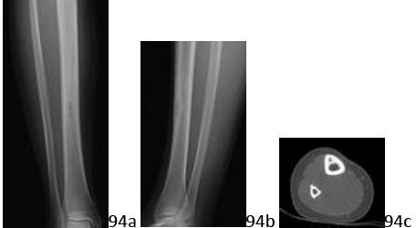 15. # 94a 94b 94c A 31-year-old woman reports right shin pain that is constant in nature, not associated with activity, and periodically awakens her from sleep at night. The patient states that nonsteroidal anti-inflammatory drugs help alleviate the pain. Radiographs and a CT scan are shown in Figures 94a through 94c. What is the most likely diagnosis?