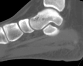 A 15-year-old girl is thrown from a snowmobile and has severe left foot and ankle pain. Her CT image is shown in Figure 96a, and a lateral radiograph is shown in Figure 96b. The arrow in Figure 96a points to which structure?