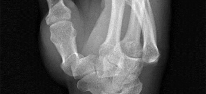 Figure 1 is the clinical photograph of a 64-year-old man who crashed while riding his motorcycle. An examination reveals his long-finger metacarpophalangeal (MP) joint is stuck in extension. He cannot passively or actively flex at the MP joint. A hand radiograph is seen in Figure