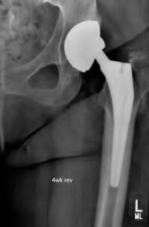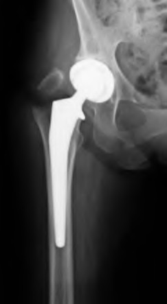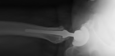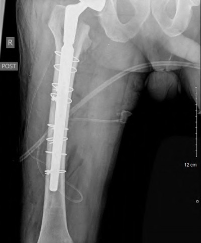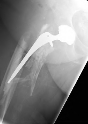 The radiograph demonstrates a periprosthetic femur fracture extending to the tip of the stem. The long spiral fracture is consistent with a loose implant. The bone stock is sufficient. Therefore, this fracture pattern would classify as a B2 using the Vancouver classification system. The Vancouver classification for periprosthetic femoral fractures is simple yet incorporates all the pertinent factors such a location, stem fixation, and bone stock. Type A is a trochanteric fracture- lesser or greater. These can be treated non-operatively usually and ORIF if symptomatic. Type B fractures are around or just below the stem and are subdivided into three types. Type B1 is a fracture with a well fixed stem.