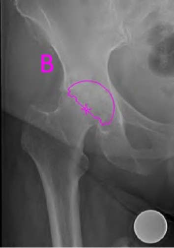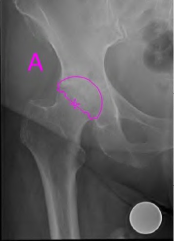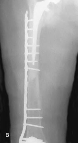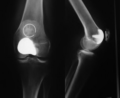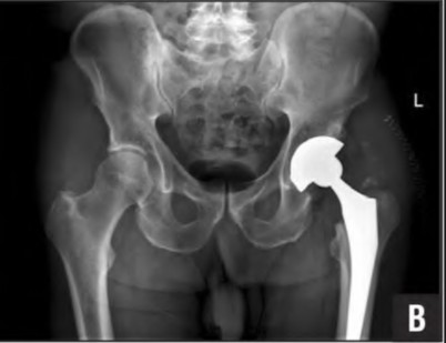 Figure A shows a lytic lesion of the proximal femur with an intramedullary implant. Figure B shows a proximal femoral replacement.