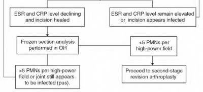 Wolff et al report Level 4 evidence of 18 patients followed an average of 5 years after bilateral TKA infection. Eleven patients were initially treated with attempts to salvage the original prosthesis (polyethylene l liner exchange, I&D, IV antibiotics and chronic oral suppressive antibiotics. With prosthesis retention, 9/11 (81%) developed recurrent infection at a mean of 15 months. The other 10 patients initially underwent resection arthroplasty with cement spacer and a course of IV antibiotics. Seven of the 10 (70%) underwent reimplantation at a mean of 3 months (6 weeks to 5 months) and none of the patients required revision at mean of two years follow up. Satisfaction rates were significantly higher among this group of patients. The authors advocate the protocol of bilateral TKA resection arthroplasty with cement antibiotic spacer and course of IV antibiotics followed by prosthesis reimplantation.