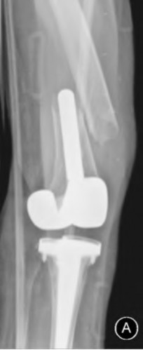 fracture site. Type B3 is a fracture with a loose stem and comminution. For younger patients, use cementless porous coated long stems with allograft struts. For older patients, consider a tumor prosthesis. Cement fixation is sometimes necessary Type C is a fracture well below the stem tip. These can be treated independently of the prosthesis.