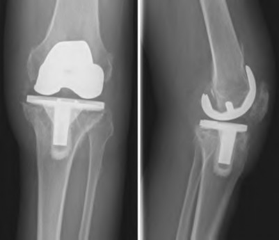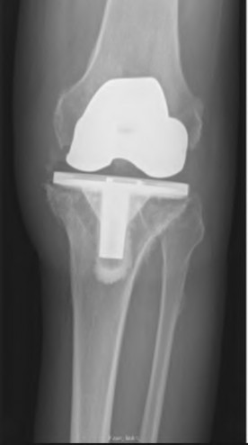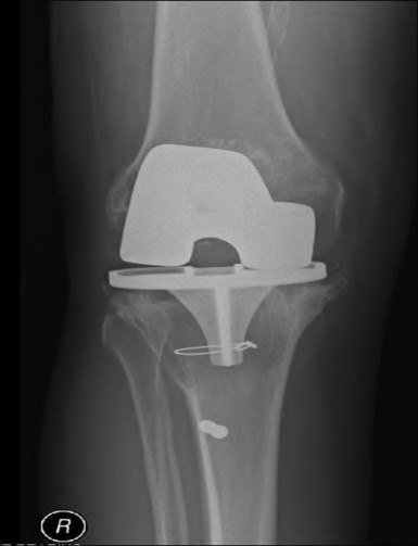 The radiograph seen in Figure A reveals varus alignment of the knee, with medial tibial deficiency; from this X-ray the patient appears to have unicompartmental arthritis. Treatment options for unicompartmental arthritis include high tibial osteotomy, interpositional arthroplasty, unicondylar knee replacement and total knee replacement. Interpositional arthroplasty became popular in the 1950’s when early outcomes analysis seemed to indicate good results; long term follow up in one study found 0/12 excellent results, with all patients requiring conversion to TKA. This procedure is no longer recommended due to the poor long term outcomes.