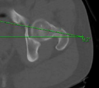 Figure E demonstrates hip anteversion of 9.2 degrees while figure F demonstrates knee external rotation of 3.2 degrees. This side exhibits 6 degrees of anteversion (9.2-3.2).