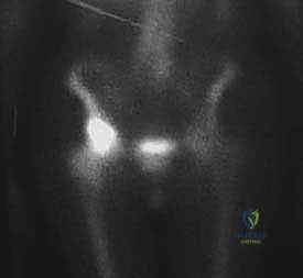 FIG 2 • B. Technetium Tc 99m bone scan showing uptake in the supra-acetabular region. No uptake is seen in the ipsilateral femur or medial acetabular wall.