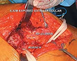 Exposure of Supra-acetabular Ilium: "With the sciatic nerve safely protected and tagged, we can now focus on exposing the iliac bone superior to the acetabulum. We'll achieve this by carefully retracting the gluteus medius and minimus muscles anteriorly."