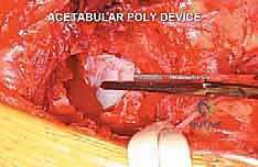 TECH FIG 1 • B. Highly cross-linked polyethylene is cut to fit the defect. The concave side of the polyethylene, taken from a tibial total knee replacement insert, is placed facing the hip joint.
