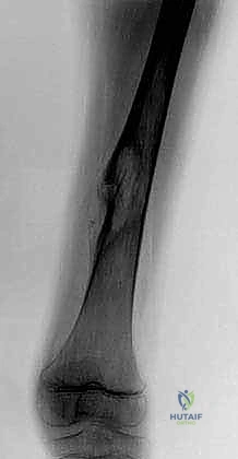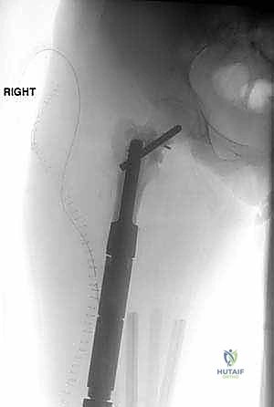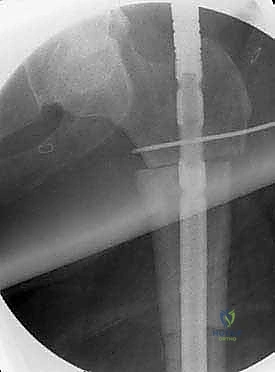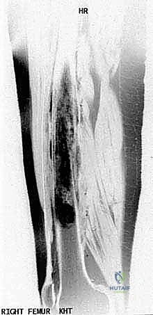 Here we see a preoperative AP radiograph, clearly delineating a diaphyseal lesion in the femur. This is our starting point for understanding the extent of bone involvement.