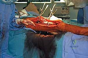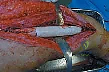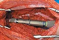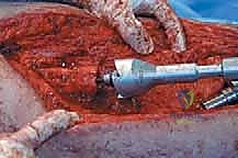 Here, you can see the power saw making a precise transverse osteotomy. Note the constant irrigation to prevent thermal damage to the bone.