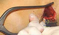 TECH FIG 4 • B. The scalpel localizing the position and forming a percutaneous incision to the desired screw hole.