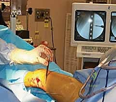 Alternatively, the well leg can be placed on a well-leg holder. This scissored or abducted position is critical as it allows us to aim the fluoroscopy unit perpendicular to the fractured leg, ensuring optimal lateral images for percutaneous screw placement.