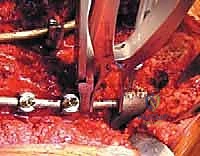 "With the contoured rods in place, we move to final fixation and the correction of the spinal deformity above this area. We'll start with the concave side first."