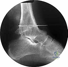 TECH FIG 2A: Lateral intraoperative radiographic view showing the Gigli saw passed at the level of the ankle malunion.