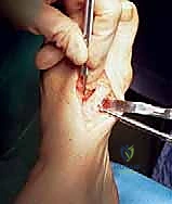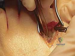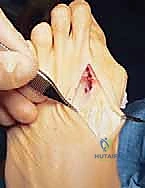 - Skin Incision: "Make a clean, longitudinal incision through the skin, from just proximal to the medial eminence to the base of the proximal phalanx. Again, gentle blunt dissection through the subcutaneous tissue."