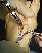 - Exposure of the proximal first metatarsal shaft for the closing wedge osteotomy.