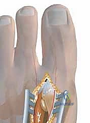 > **Surgical Warning:** As you deepen this incision, remember that directly beneath the transverse metatarsal ligament lies the **common digital nerve to the first web space and its accompanying vessels**. Exercise extreme caution; we only cut ligamentous tissue, never blindly dissecting.