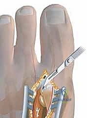 TECH FIG 5 • The scalpel has been placed through the dorsal aspect of the lateral joint capsule of the first metatarsophalangeal joint.