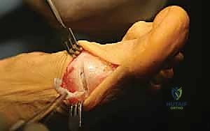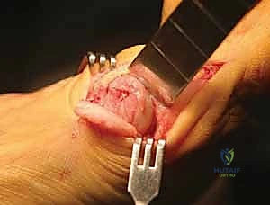 - Transection of the Transverse Metatarsal Ligament: With the ligament clearly identified and under tension from the retractor, I'm using a small scalpel blade to carefully transect it. This releases the tethering between the metatarsal heads.