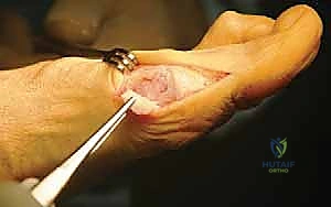 - Plantar Flap Elevation & Abductor Hallucis Identification: Next, dissect the skin flap off the plantar half of the capsule until the abductor hallucis muscle and tendon are identified.