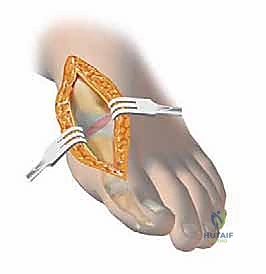 * Adductor Tendon Reattachment (Optional): The figure-of-eight suture previously placed in the adductor hallucis tendon can now be used to reattach the tendon to the lateral aspect of the metatarsal head periosteum or the lateral capsule. This step helps to further balance the forces across the MTP joint.