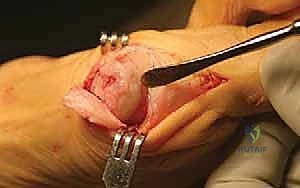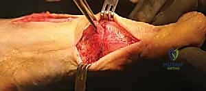 - Identify the contracted capsule between the subluxated fibular sesamoid and the lateral base of the first metatarsal head.