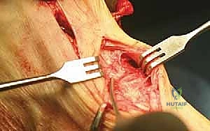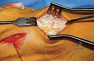 TECH FIG 8 • Exposure of the medial joint capsule, showing the parallel cuts that represent the vertical limbs of the capsulotomy.