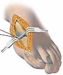 > Surgical Warning: As we make the cut through the abductor hallucis tendon, keep the tip of the knife blade inside the joint. The plantar medial cutaneous nerve lies just plantar to the abductor tendon, and accidental injury can lead to painful neuromas. - Capsulotomy Design (Modified H-Incision):
