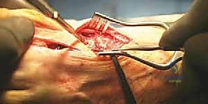 TECH FIG 3 • The adductor tendon has been detached from the lateral aspect of the fibular sesamoid and is being held in the forceps.
