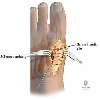 * Screw Measurement and Insertion: Measure the guide pin to determine the correct screw length. Typically, a 28 to 30 mm partially threaded 4.0-mm cannulated screw is used. Insert the screw across the osteotomy site and carefully tighten it.
