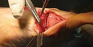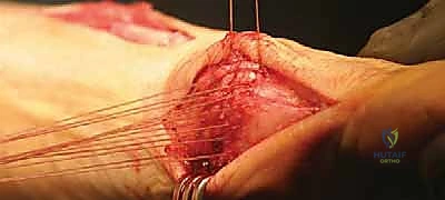 With the osteotomy corrected and fixed, our final step is to reconstruct the medial joint capsule to help maintain the correction and stabilize the joint.