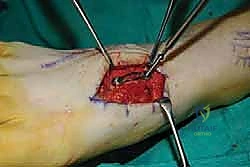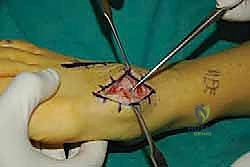 - "Let's make a small stab incision over the medial aspect of the medial cuneiform, just through the skin. Use a small hemostat to dissect down to bone, carefully retracting the tibialis anterior tendon."