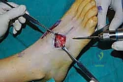 - "Now, let's stabilize the second metatarsal. We'll use a guide pin from our 3.0-mm cannulated screw set for this. Make a small stab incision dorsally, protecting the tibialis anterior tendon."