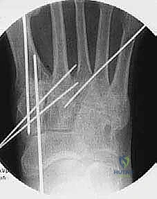 - "Next, place a second 0.062 K-wire. This one goes from the dorsal aspect of the first metatarsal shaft, angling proximally and slightly plantar, into the plantar aspect of the medial cuneiform. These two crossed K-wires will hold the first TMT joint securely in its reduced position."