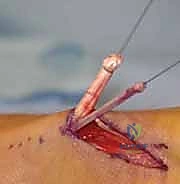 * Pass the FCR tendon subcutaneously around the radial border of the forearm, delivering it into the dorsal wound. The path should be smooth and direct.