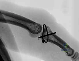 - V Sign: On a post-reduction true lateral radiograph, divergence of the dorsal articular surfaces from the central portion of the joint creates a V-shaped gap. This indicates an incompletely reduced joint.