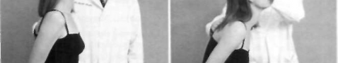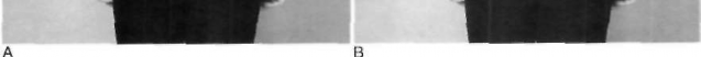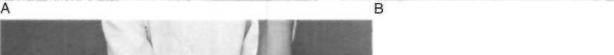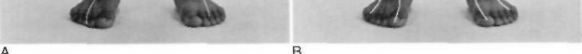 Figure 9-2. A and B, A list to the left. Note the asymmetry of the spaces between the arms and the trunk in A and the increase in the list with flexion in B.