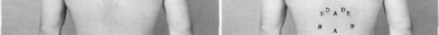 Figure 9-1 . A, B, and C, Posterior aspect of the lumbar spine. A, spinous processes; B, erector spinae; C, iliac crests; D, posterior facet joints; E, transverse processes. D, Posterior aspect of the lumbar spine in flexion.