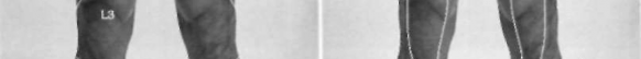 collectively known as the erector spinae, or sacrospinaiis. The erector spinae is split longitudinally into three components. From medial to lateral on each side, they are the multifidus, the longissimus, and the ilia-costalis muscles. The individual contours of these muscles cannot be discerned because they lie deep to the lum-bodorsal fascia, and they are visualized as a group. The prominence due to the paraspinous muscles should be equal on both sides of the spine. In the presence of paraspinous muscle spasm, the contour of the muscles on one side of the spine may stand out in visibly greater prominence than those on the opposite side. Although almost any painful lesion of the lumbar spine may cause paraspinous spasm, the most common cause of asymmetric spasm is paraspinous muscle strain.