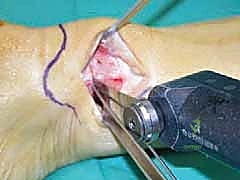 * Dissection: We carefully deepen our incision through the subcutaneous tissues. The skin flaps are mobilized minimally, taking care not to damage the neurovascular bundle that runs along the anterior border of the medial malleolus. We then identify the posterior tibial tendon, incise its sheath longitudinally, and retract it posteriorly with a blunt Hohmann retractor. This exposes the medial surface of the distal tibia.