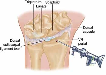 - 3-4 Portal: "First, the 3-4 portal. Make a small stab incision, then use a blunt trocar and cannula to enter the joint. Always aim towards the scaphoid, away from the lunate, to avoid damaging articular cartilage. Once in, insert the 2.7-mm, 30-degree arthroscope."
