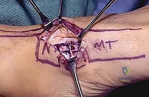 - Incision: Make a longitudinal incision over the base of the third metatarsal.