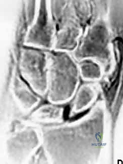 FIG 3 • B. Coronal MRI showing the remnants of the disrupted proximal membrane hanging into the scapholunate gap, which is filled with fluid.