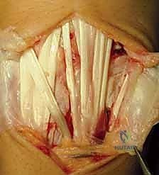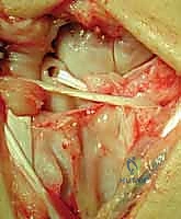 * Isolate the FCR tendon. We will harvest a strip approximately 10-12 cm in length and about one-third to one-half the width of the main tendon. Leave the distal insertion of the FCR intact at the base of the second metacarpal.