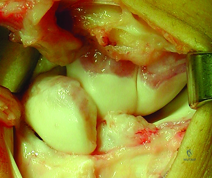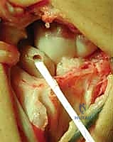 * With the capsular flap retracted radially, we now have a direct view of the scapholunate interval. This is your opportunity to meticulously inspect the injury (as indicated by the arrow in the figure). Confirm the extent of the ligamentous tear and the condition of the articular cartilage. This is our final confirmation before proceeding with the tenodesis.